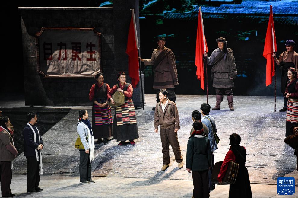 當日,話劇《老西藏》在西藏大劇院首演。該劇是西藏自治區(qū)文化廳打造的重點原創(chuàng)劇目,聚焦不同時期文化、水利、交通、教育、衛(wèi)生等各條戰(zhàn)線上的西藏建設者,講述他們奉獻青春年華的熱血故事。
