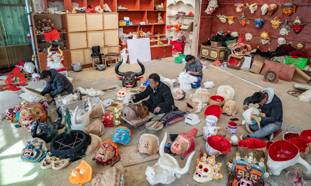 拉薩達孜區(qū)雪鄉(xiāng)民間傳統(tǒng)手工藝農(nóng)民專業(yè)合作社的工匠在合作社門前的空地上佩戴檢查做好的西藏傳統(tǒng)面具。
