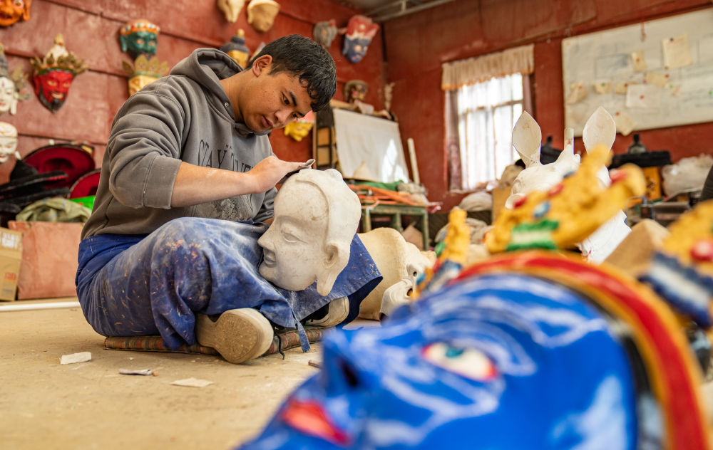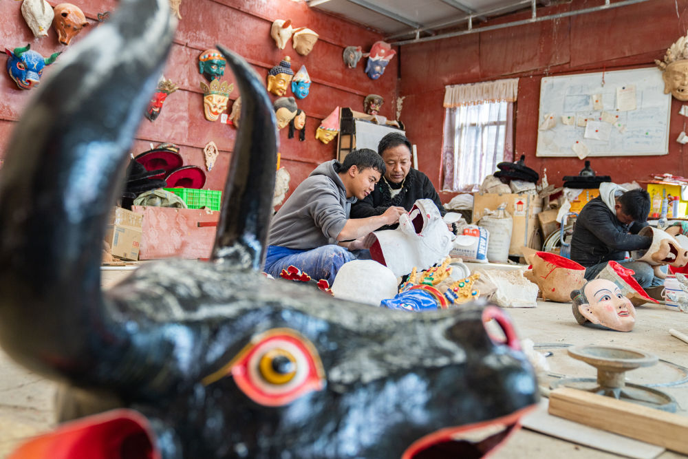 拉薩達孜區(qū)雪鄉(xiāng)民間傳統(tǒng)手工藝農(nóng)民專業(yè)合作社的面具制作工匠制作傳統(tǒng)面具。