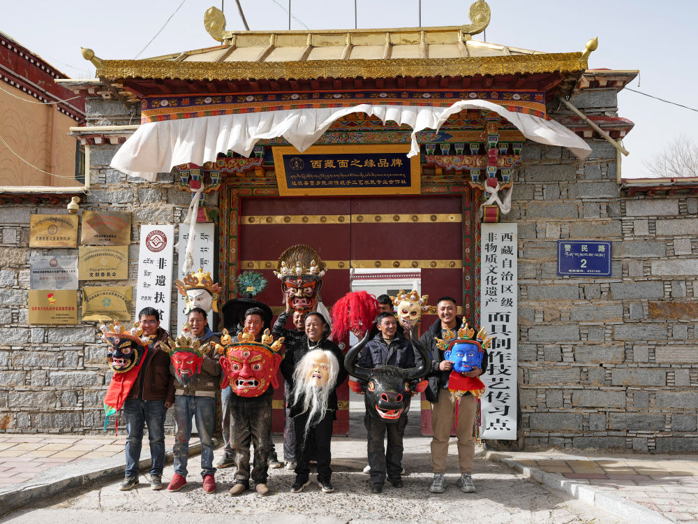 拉薩達孜區(qū)雪鄉(xiāng)民間傳統(tǒng)手工藝農(nóng)民專業(yè)合作社的面具制作工匠們在合作社門口合影。