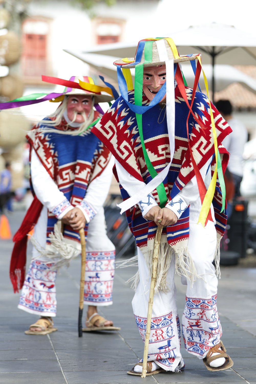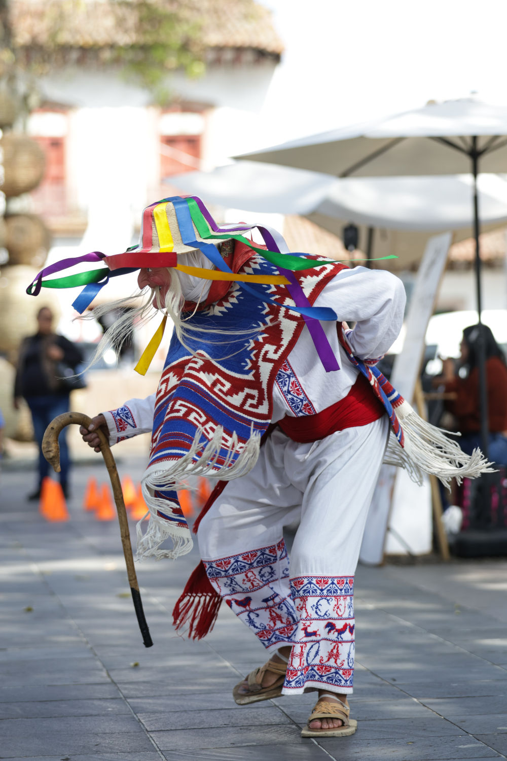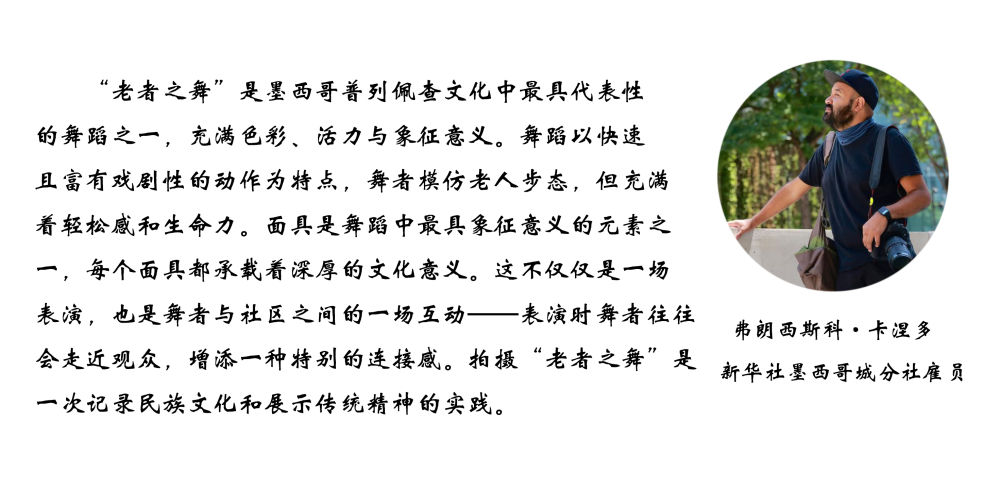 面具制作在墨西哥也有著悠久的歷史,有各式各樣的面具用于各種舞蹈和慶典。舞者表演“老者之舞”時往往配戴著略顯夸張的面具,面具通常帶有皺紋、胡須和微笑的表情,借以塑造一種看似滑稽、幽默卻充滿智慧的形象。除了老人面具,舞者表演時還會穿著傳統(tǒng)的普列佩查民族服飾,包括刺繡彩色披肩、白色農(nóng)民風格的長衫和編織草帽,整體造型鮮艷、喜慶。舞蹈表演時舞者會模仿老人的步態(tài),以滑稽的方式彎腰駝背,手持拐杖或木棍,搖搖晃晃地邁步,同時做出靈活的跳躍和旋轉(zhuǎn)動作,展現(xiàn)一種出人意料的活力與生命力。