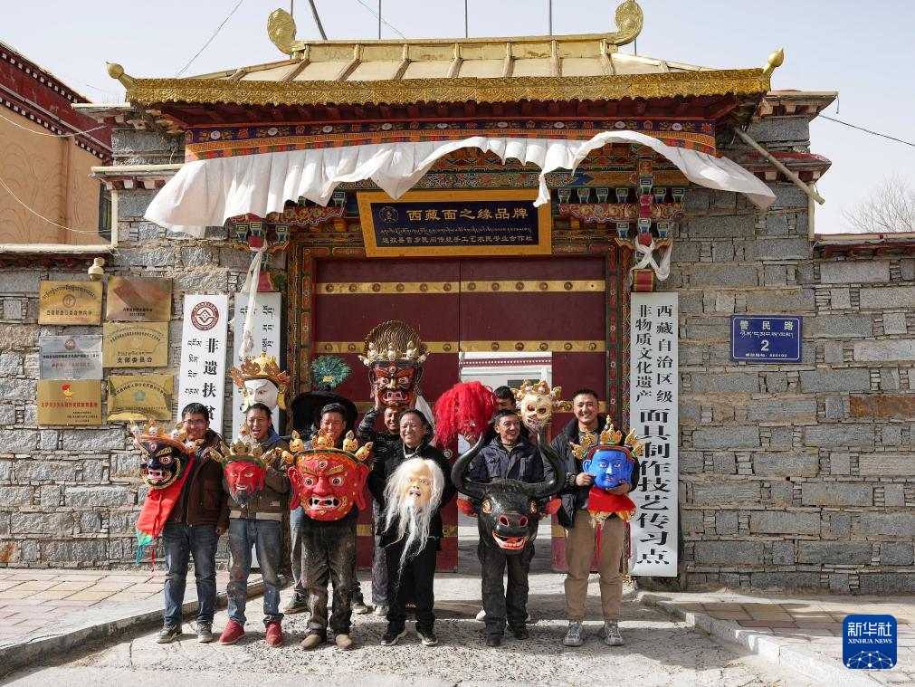 12月9日,拉薩達孜區(qū)雪鄉(xiāng)民間傳統(tǒng)手工藝農(nóng)民專業(yè)合作社的面具制作工匠們在合作社門口合影。新華社記者 晉美多吉 攝