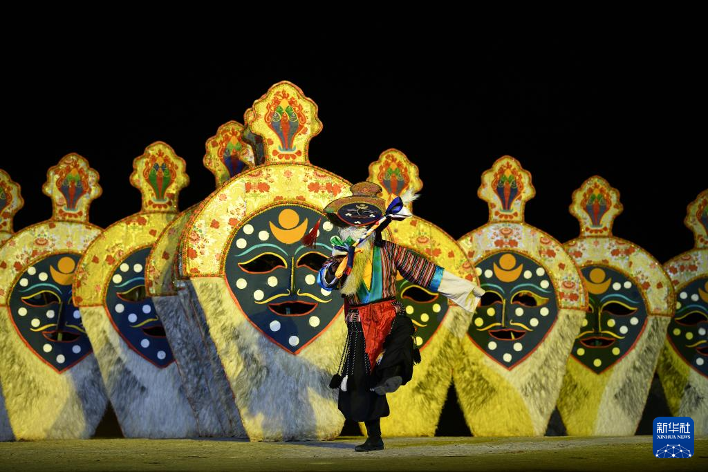 2021年4月10日,演員在大型實景劇《文成公主》中表演藏戲片段。拉薩布制面具制作技藝西藏自治區(qū)級非遺傳承人西洛創(chuàng)辦的拉薩市達孜區(qū)雪鄉(xiāng)扎西崗傳統(tǒng)手工藝合作社多次為該劇提供道具支持。新華社記者 孫瑞博 攝