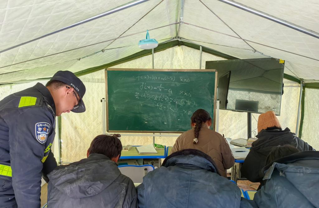 白天,“民警老師”輪流救援和授課;夜晚,他們擠在帳篷里,對著手機屏幕搜索習(xí)題資料,討論哪些題目適合學(xué)生練習(xí)。