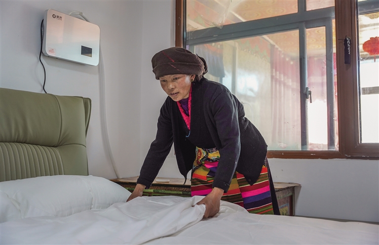 倫珠曲珍今年40歲,是這家的二女兒,15年前嫁到外村,每年都會(huì)回來看望父母。由于同行的人員出現(xiàn)高反癥狀,倫珠曲珍便主動(dòng)邀請(qǐng)記者到他們家的“高原暖心房”里休息調(diào)整。“高原暖心房”設(shè)置在她家客廳的里側(cè),屋內(nèi)寬敞明亮、干凈整潔。墻壁上的恒溫裝置讓屋子始終保持在宜人的20攝氏度左右?!拔覀兇蛟斓摹咴姆俊銣匦Ч貏e好,最高溫度能達(dá)到30多攝氏度。而且因?yàn)槭褂玫牟馁|(zhì)特殊,就算不開恒溫裝置,幾個(gè)人待在屋里也不會(huì)覺得冷??纯催@些家具,都是村里愛心小屋提供的。”廖旭東介紹道。