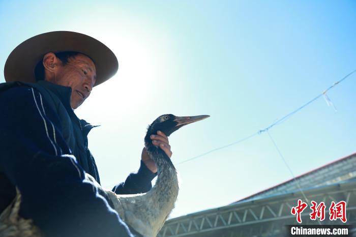 圖為尼瑪次仁與康復(fù)的黑頸鶴在放歸前的合影。洛克 攝