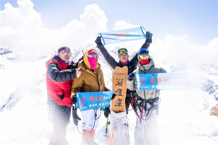 當(dāng)部分山友抵達(dá)洛堆峰一處近60度坡度冰面時(shí),太陽(yáng)緩緩升起,金色的陽(yáng)光照射在山友們身上,寒冷、缺氧時(shí)刻考驗(yàn)著每一個(gè)人,但大家邁著堅(jiān)定的步伐繼續(xù)攀登。經(jīng)過數(shù)小時(shí)的攀登,來自西藏民族大學(xué)體育學(xué)院的3名學(xué)生,最先沖頂成功。隨后,陸續(xù)有山友安全挺進(jìn)洛堆峰海拔6010紀(jì)念碑處。大家共同見證了雪山之巔的壯麗風(fēng)景。