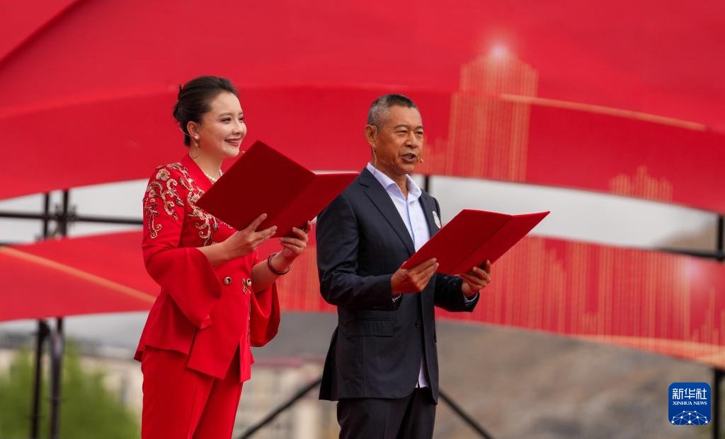 5月25日,主持人與全國(guó)道德模范尼瑪次仁(左)在現(xiàn)場(chǎng)互動(dòng)。新華社記者 晉美多吉 攝