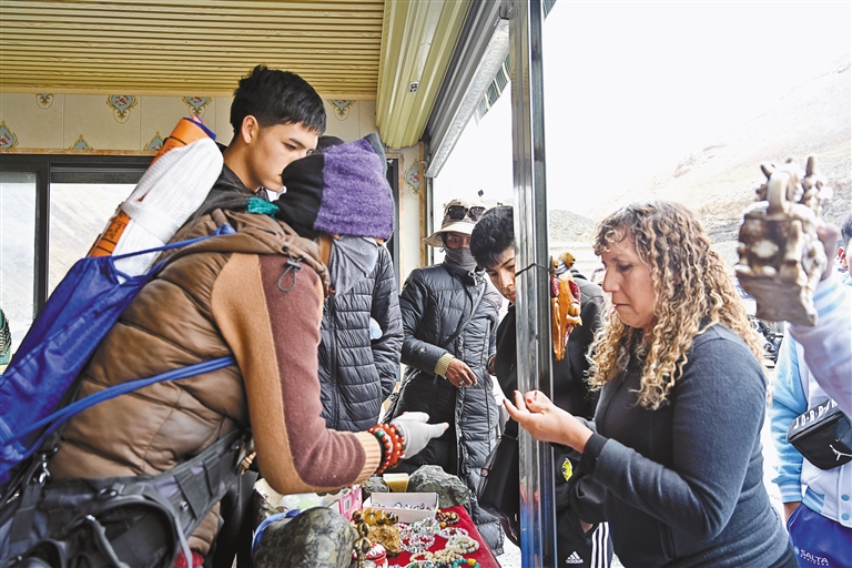 新奇感過后,游客們開啟購物模式?!鞍⒓眩@個(gè)掛飾可以定制嗎?”“你們可以發(fā)快遞嗎?”對(duì)于一連串的問題,阿佳格桑忙碌地一一回答著,“你們想要什么圖形,我們就給你定制什么圖形。”“我們這兒快遞很快,今天下單明天就給你發(fā)!”短短半個(gè)小時(shí),“阿佳格桑工坊”的生意火爆,銷售藏式靠墊、藏式地毯、掛飾等特色產(chǎn)品4000多元?!盎厝ズ?,我要通過自媒體平臺(tái),宣傳這次西藏之旅的所見所聞,讓更多親朋好友來西藏旅游!”日本游客琴音有感而發(fā)。