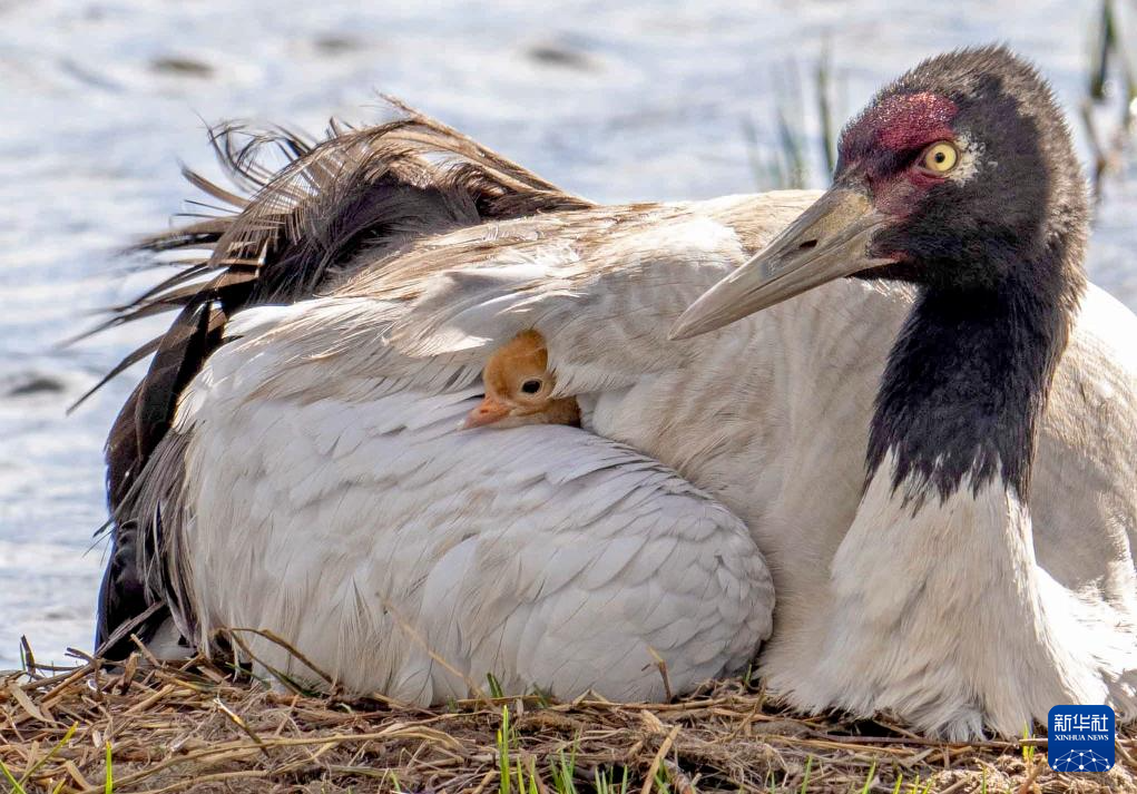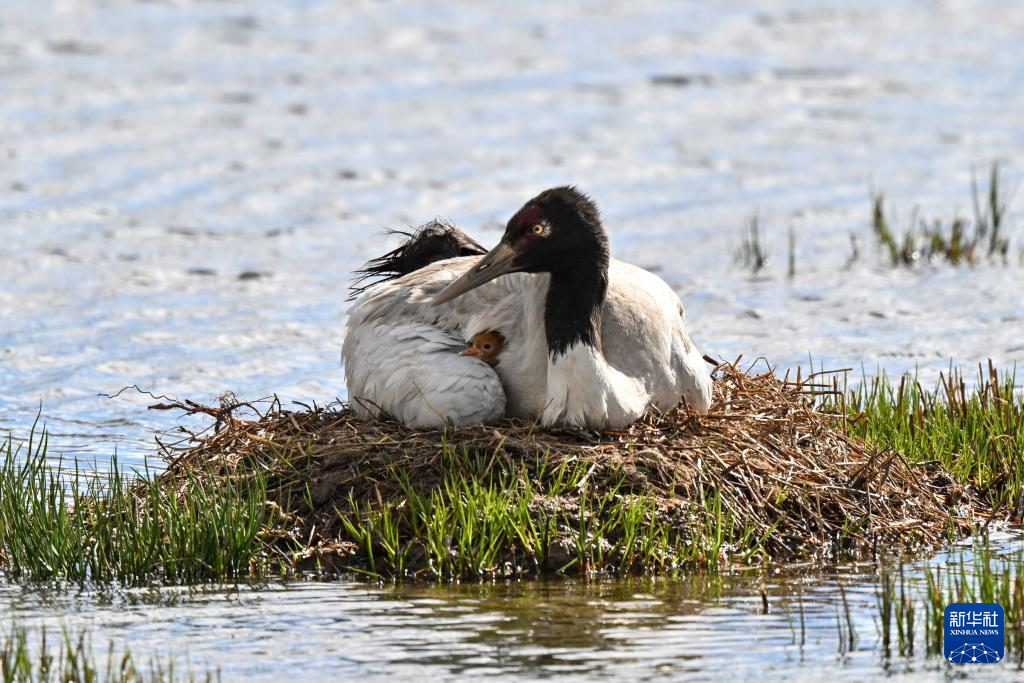 一對黑頸鶴在那曲市申扎縣的濕地上照顧剛出殼的雛鳥,一只將其護(hù)在身下保持溫暖,另一只則在旁保持警戒(6月4日攝)。新華社記者 姜帆 攝