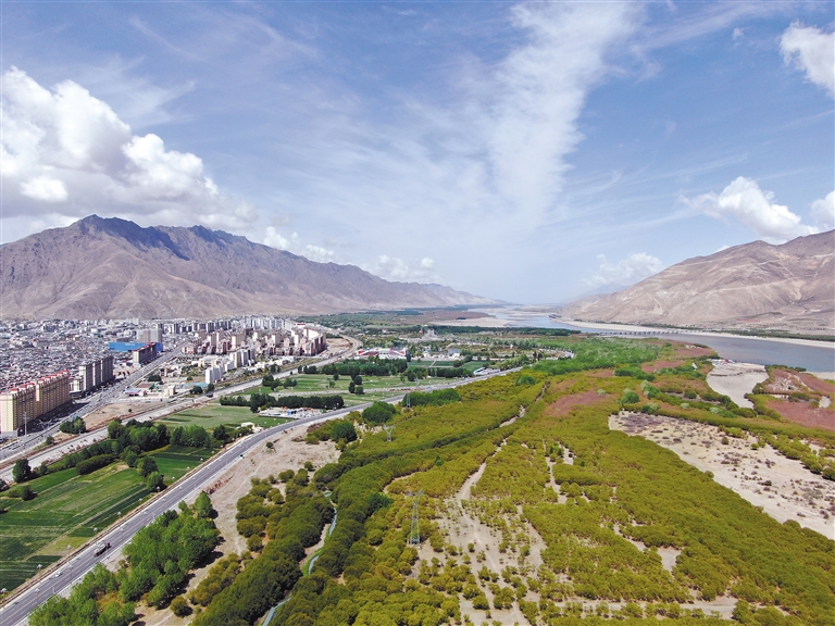 雅江中游“百里綠色生態(tài)長(zhǎng)廊”與日新月異的山南市區(qū)和諧共生,展現(xiàn)出高原獨(dú)有的生態(tài)之美(無人機(jī)照片)。記者 武沛濤 攝
