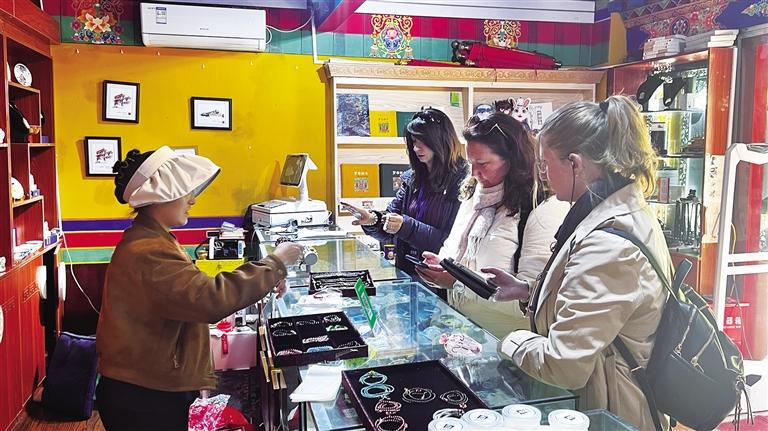 國際旅行商在文創(chuàng)店內購買紀念品。