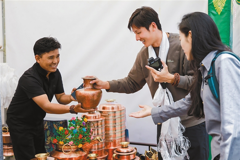 在西藏非遺工坊促銷(xiāo)展示活動(dòng)中直播帶貨。