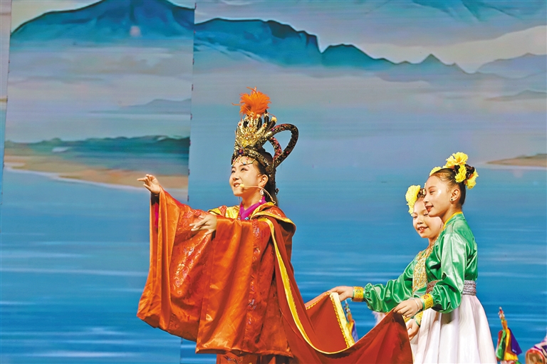 舞臺中央,12歲的其美卓嘎身著錦繡華服,以清亮唱腔和靈動演繹,將文成公主的溫婉堅(jiān)毅展現(xiàn)得淋漓盡致?!爱?dāng)我穿上戲服、唱起‘漢藏情誼潔如璧’時,仿佛真的穿越到千年前的和親之路?!毖莩鼋Y(jié)束后,小姑娘眼中閃爍著興奮的光芒,“原來民族團(tuán)結(jié)的故事,就藏在這些古老而動人的戲文里。”其父親倫珠難掩自豪:“文成公主促進(jìn)了漢藏交融,女兒能表演這個節(jié)目,用藏戲詮釋民族團(tuán)結(jié),是我們?nèi)业尿湴粒 ?/p>