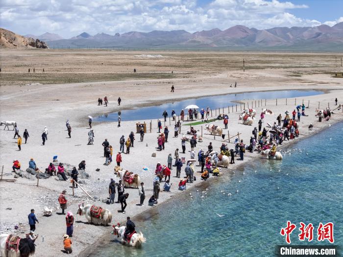 6月26日,隨著氣溫逐漸升高,西藏納木錯迎來旅游旺季。納木錯,藏語意為“天湖”,位于西藏自治區(qū)中部,拉薩市當(dāng)雄縣和那曲市班戈縣之間,面積超2000平方公里,湖面海拔4718米,是世界海拔最高的大型咸水湖。圖為游客在納木錯湖邊拍照留念。中新社記者 貢嘎來松 攝