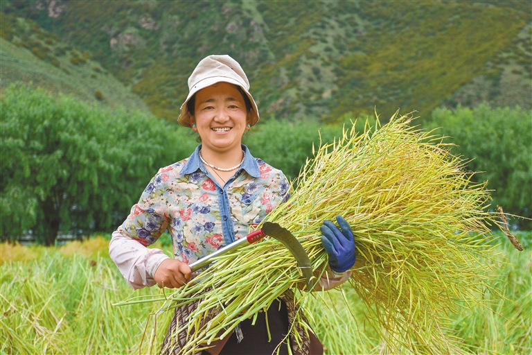 嘎拉村村民在收割油菜。記者 劉楓 攝