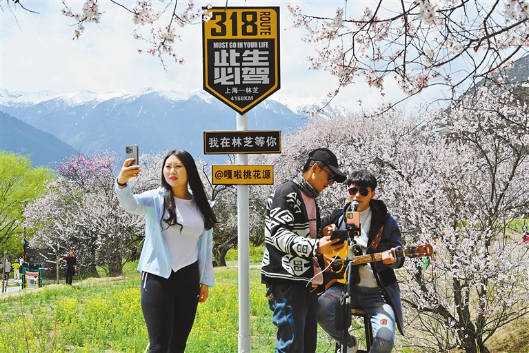 游客在嘎拉村打卡留念。記者 白瑪澤旺 攝