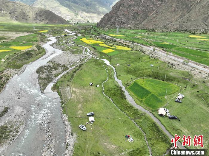 7月5日,西藏拉薩市風(fēng)和日麗,宜人周末里,市民紛紛前往近郊“過(guò)林卡”。在堆龍德慶區(qū)古榮鎮(zhèn)楚布溝,帳篷林立,歡聲笑語(yǔ)不斷。人們圍坐野餐,享受美食,伴著高原美景談天歌唱,孩童嬉戲奔跑,在自然中放松身心,延續(xù)傳統(tǒng)休閑樂(lè)趣 。圖為市民在楚布溝里“過(guò)林卡”。(無(wú)人機(jī)照片)中新社記者 貢嘎來(lái)松 攝