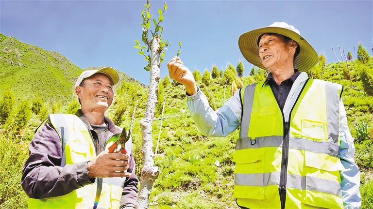 在2號(hào)片區(qū),一支特殊養(yǎng)護(hù)隊(duì)伍映入眼簾。十幾位藏族村民在技術(shù)員的指導(dǎo)下修剪枝條,掌握技術(shù)后將成為專(zhuān)業(yè)管護(hù)人員。村民的動(dòng)作略顯生疏,但專(zhuān)注的神情流露出對(duì)樹(shù)苗的珍視。