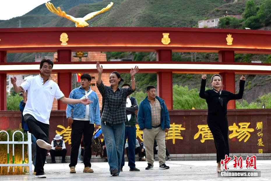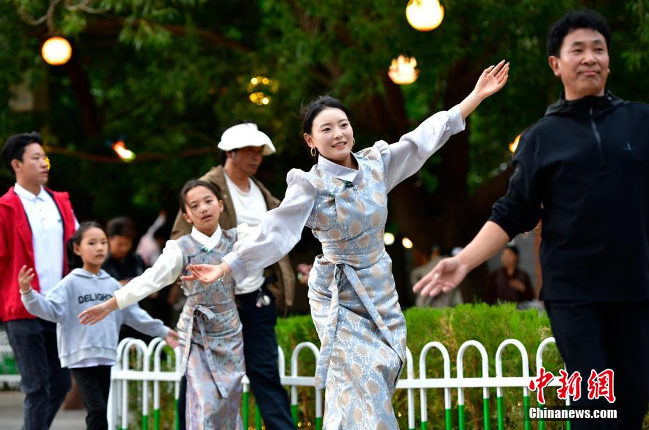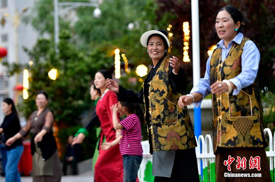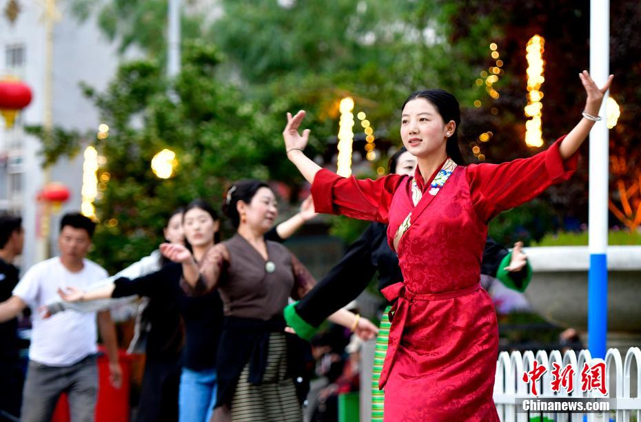 7月13日,西藏昌都瀾滄江天津廣場(chǎng)上,鍋莊舞愛好者踏歌起舞,舞出夏日夜間精彩。中新社記者 李林 攝