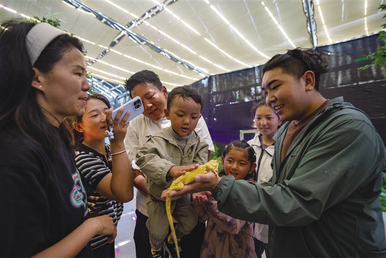 扎囊縣西普休閑觀光農(nóng)業(yè)發(fā)展有限公司建設的海洋館內(nèi)小孩正在與蜥蜴互動。