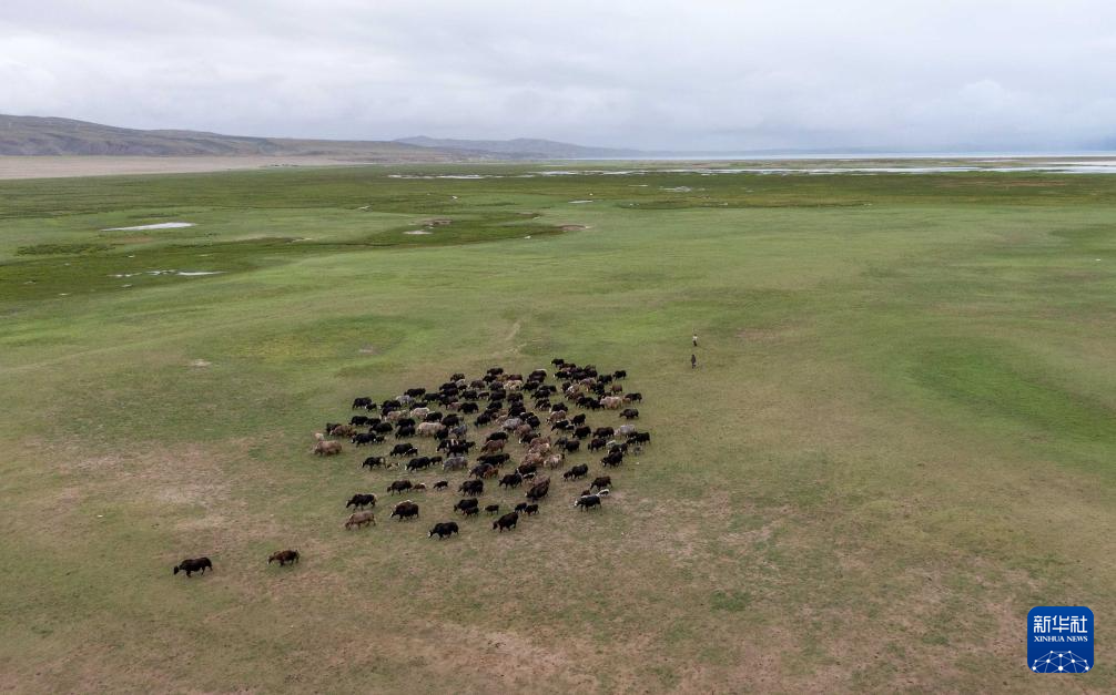 7月22日拍攝的瑪旁雍錯(cuò)濕地上的牦牛(無人機(jī)照片)。新華社記者 旦增尼瑪曲珠 攝