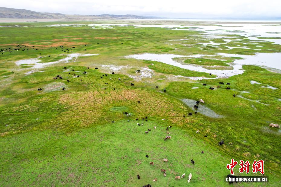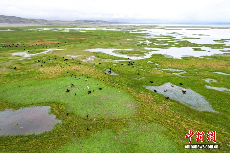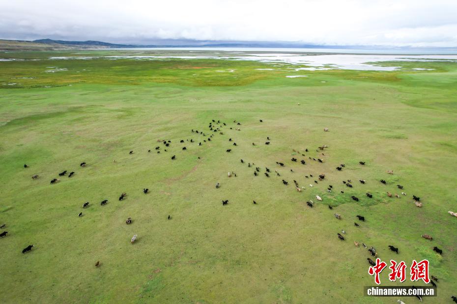 7月22日,在西藏阿里地區(qū)普蘭縣霍爾鄉(xiāng),牧民在瑪旁雍錯濕地上放牧牦牛。為實現(xiàn)更大的經(jīng)濟(jì)效益,霍爾鄉(xiāng)近年來探索建立牦牛養(yǎng)殖專業(yè)合作社,按當(dāng)?shù)刈匀粭l件合理分配牦牛放牧地點,并將牛奶進(jìn)行加工銷售,2023年該合作社的年總收入達(dá)到60余萬元人民幣,帶動牧民人均增收2萬余元人民幣。(無人機(jī)照片)中新社記者 張祥毅 攝