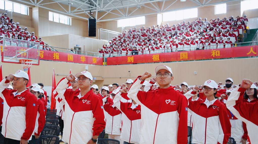 7月29日,2025年大學(xué)生志愿服務(wù)西部計劃服務(wù)西藏專項志愿者出征儀式上,志愿者們正在宣誓。陳梟 攝