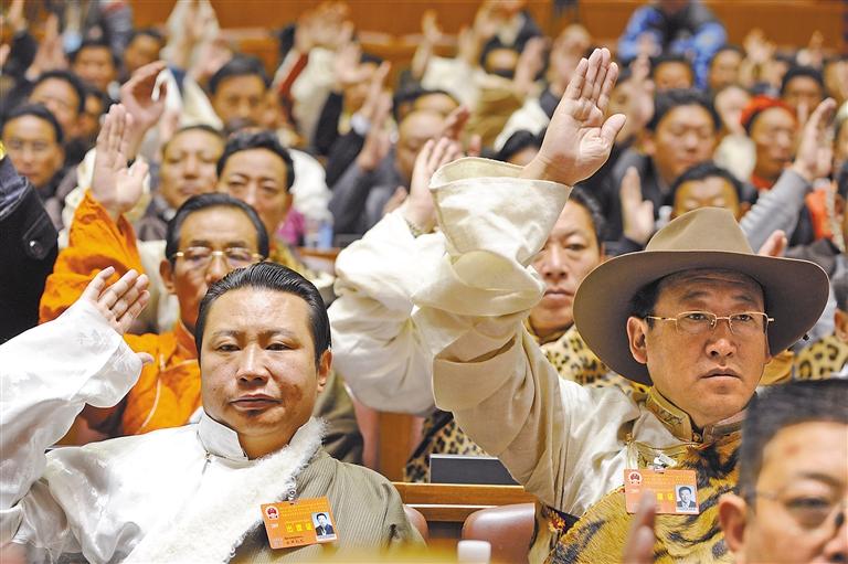 在舊西藏,占總?cè)丝诓坏?%的三大領(lǐng)主(官家、貴族和寺院上層僧侶)占有全部生產(chǎn)資料,而占總?cè)丝?5%以上的農(nóng)奴和奴隸沒有人身自由。西藏民主改革特別是西藏自治區(qū)成立以來,民族區(qū)域自治制度得到堅決貫徹,各族人民參與民主政治建設(shè)的熱情持續(xù)高漲:農(nóng)奴的后代當選人大代表,通過人民代表大會制度參與國家治理;截至目前,全區(qū)四級人大代表42000余人中,藏族和其他少數(shù)民族約占89%;門巴、珞巴等人口不足萬人的民族,在全國及西藏人大均有代表——雪域高原各族兒女依法行使民主權(quán)利,真正成為命運的主宰者。