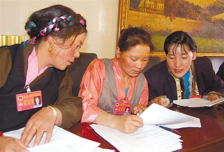 圖為西藏自治區(qū)九屆人大一次會議期間,來自拉薩市的格桑卓嘎、洛桑卓嘎、梅朵卓瑪三位代表一起審議政府工作報告(2008年攝)。