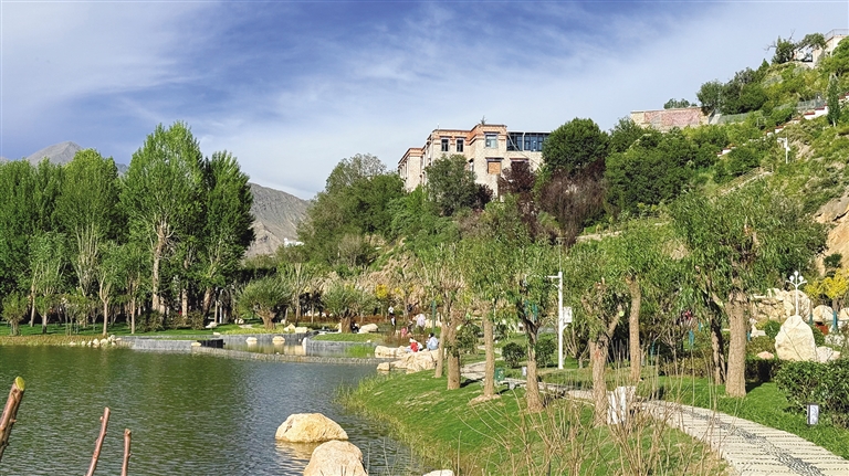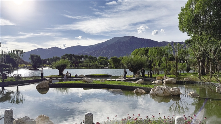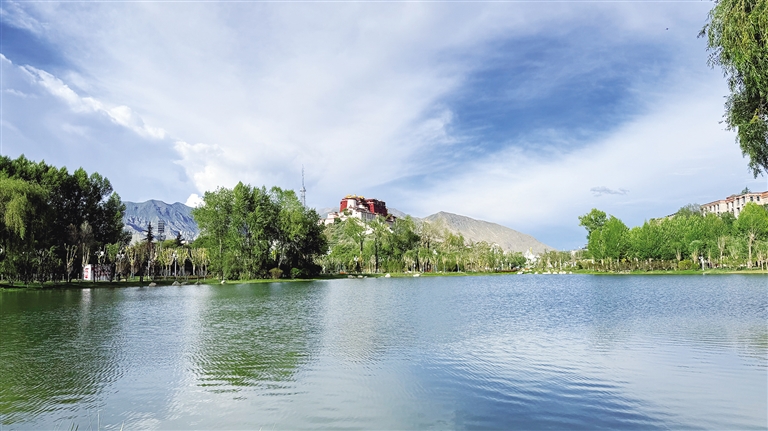 拉薩團(tuán)結(jié)公園坐落于布達(dá)拉宮西麓、藥王山腳下。昔日,這里房屋高低錯雜、線纜交錯密布、市場喧鬧擁擠、環(huán)境喧囂擾攘,不僅影響城市形象和生態(tài)環(huán)境,還影響出行游玩體驗。如今,湖水如碧綢般清澈,岸邊綠樹成蔭,各類花卉競相綻放,昔日雜亂之地已蛻變?yōu)轸浯涿髦?,人文古跡與自然景致相映成趣,共同繪就出“百澤繞城·水城相依”的生態(tài)文明畫卷。