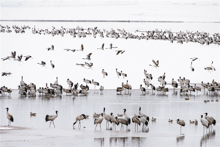“2018年申扎濕地公園建成后,每年都會(huì)有黑頸鶴來(lái)到這里養(yǎng)育寶寶。”正在散步的居民瓊達(dá)笑著告訴記者,“黑頸鶴是申扎縣的‘明星’,也是申扎縣良好生態(tài)的一張名片。我們爭(zhēng)當(dāng)黑頸鶴的保護(hù)者,顯然黑頸鶴也把我們當(dāng)作它們的好朋友了。”