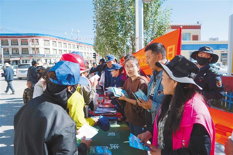 圖為那曲市索縣各普法成員單位工作人員為過往群眾發(fā)放生態(tài)環(huán)保相關(guān)宣傳資料。本報通訊員 益西卓嘎 攝