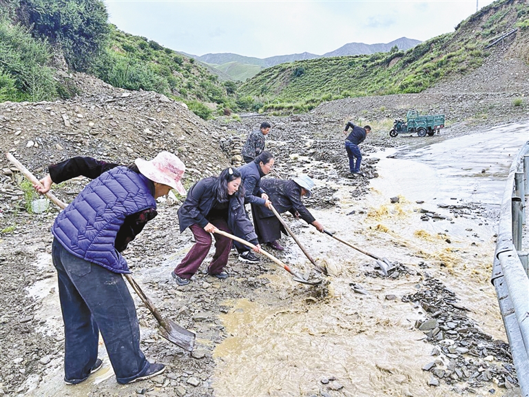 圖為駐村工作隊(duì)隊(duì)員與群眾一起疏通道路。