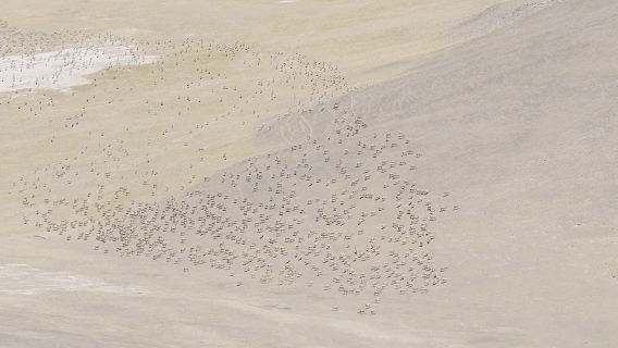 在這段來(lái)時(shí)無(wú)比顛簸的路上,我們?nèi)缏钠降?。時(shí)間好像凍結(jié)了,直到我們登上那個(gè)山坡,數(shù)不盡的藏羚羊挑破了凝固的空氣,成千上萬(wàn)的脊背在山坡上流動(dòng),山脊上藏羚羊的剪影印刻在天際線上。