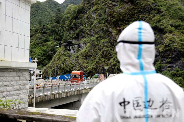 圖為民警正在使用無人機對貨運通關現(xiàn)場進行實時監(jiān)測 攝影:尼瑪?shù)┰?/p>