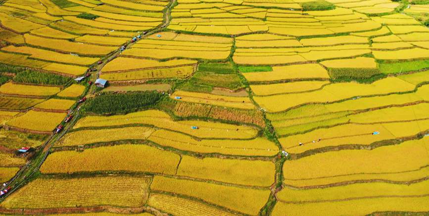 從雅魯藏布江流域的河谷地帶到藏北草原,從露天果園到溫室大棚,從海拔3000米到近5000米,秋風(fēng)送來豐收的香氣——田野里,各種農(nóng)業(yè)機(jī)械往來穿梭,穿著紅色馬甲的志愿者組成一支支秋收突擊隊(duì),和當(dāng)?shù)卮迕褚黄鸨济υ谔镩g地頭;果園里,現(xiàn)代化的溫室大棚鱗次櫛比,果蔬飄香,成為秋日里動(dòng)人的風(fēng)景。